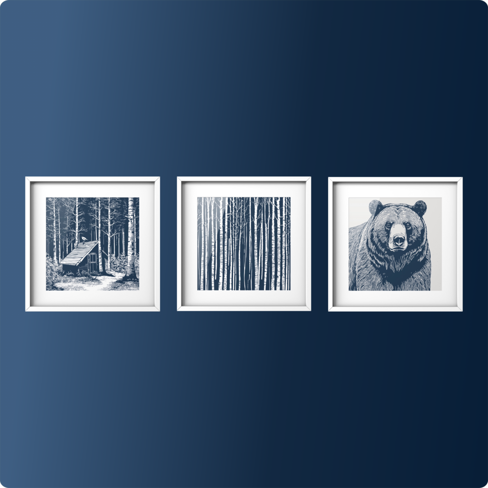 Three blue monochrome serigraphy posters evoke a forest's tranquility, a hunter's solitude, and a bear's majesty, harmonizing nature's essence.
